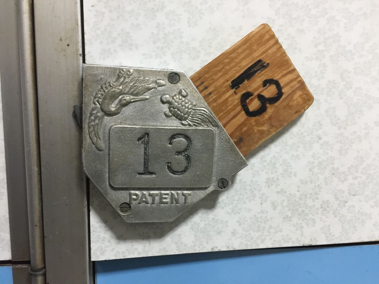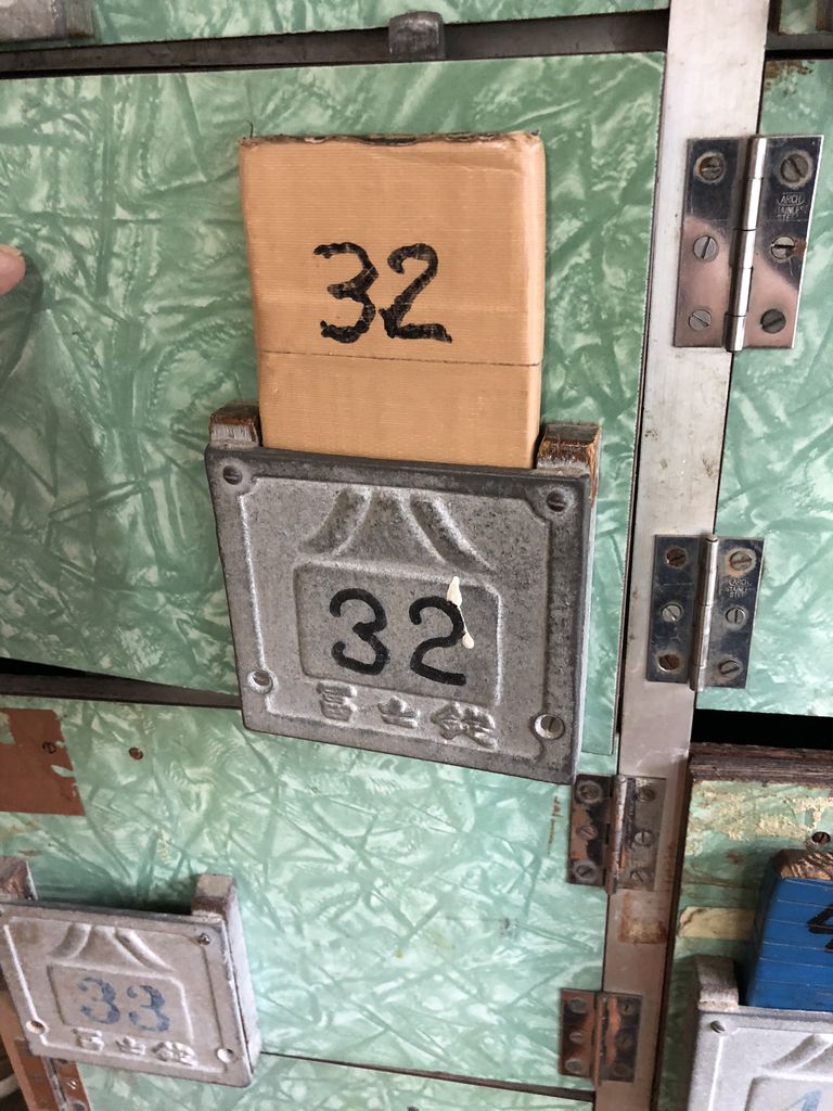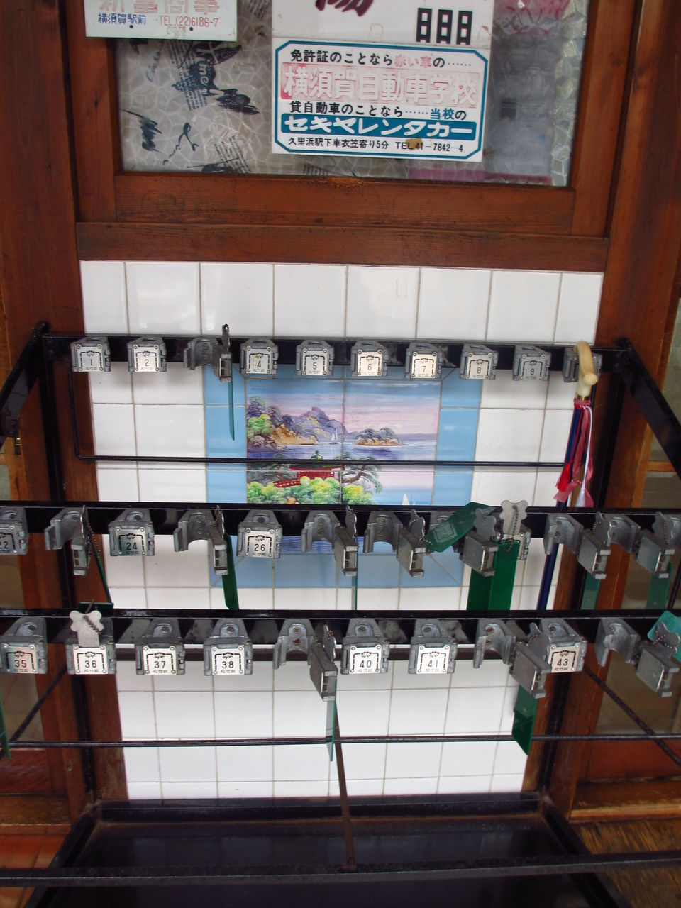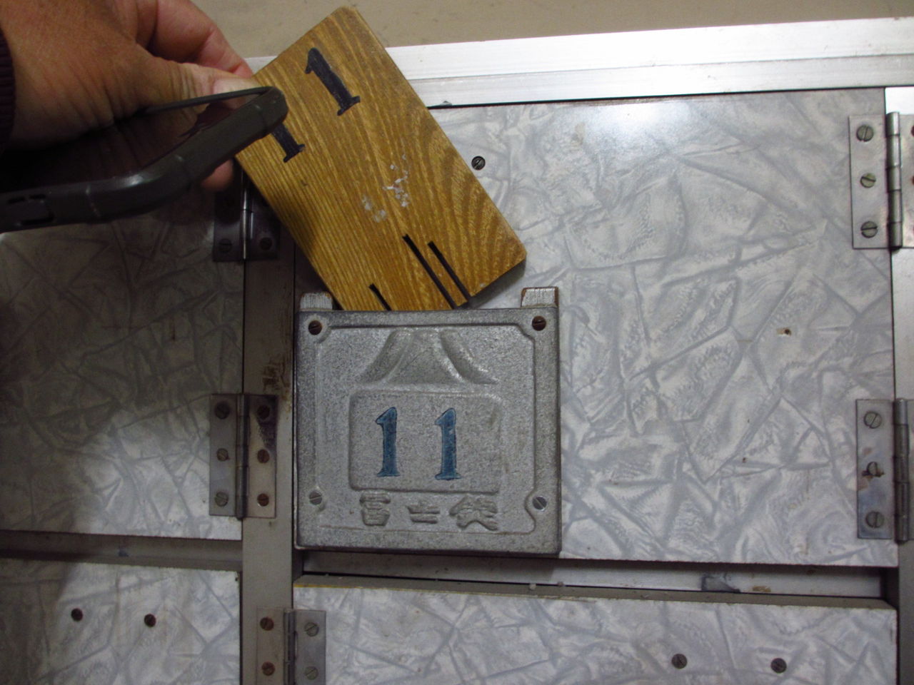 入口側壁に会社のロッカールームにあるようなスチール製の灰色ロッカーが二段に並ぶ。