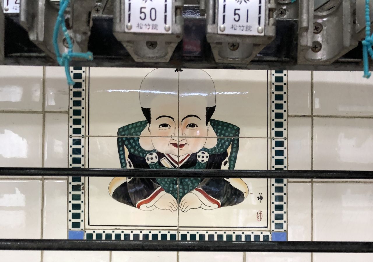 入口両脇と下足スペースの突き当りにはタイル絵がある。