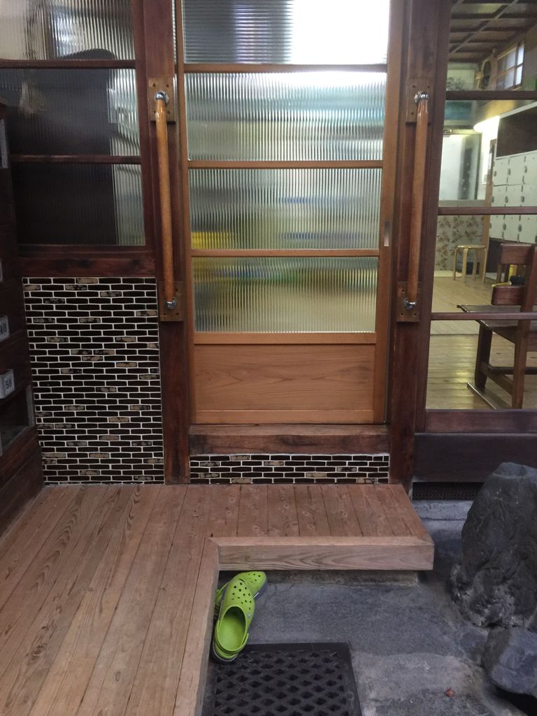 柳井湯は男女別の入口を入ると渡り廊下のような通路で男女境に下足箱。